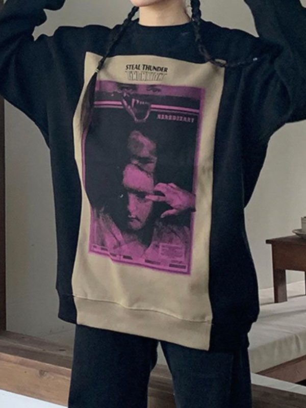 Vintage Portrait Print Splice Crew Neck Sweatshirt