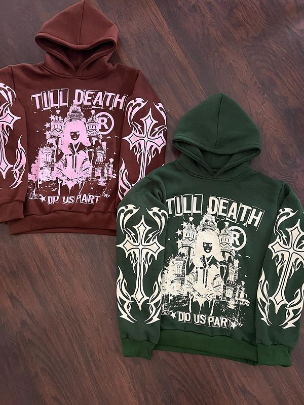 Vintage Cross Rhinestone Print Zip Up Oversized Hoodie