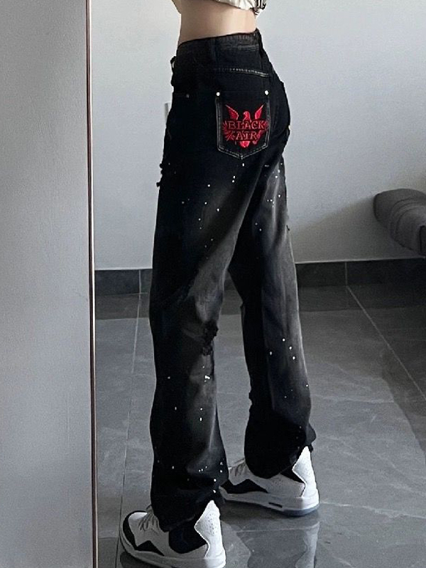 Skull Print Vintage Blue Wide Leg Boyfriend Jeans