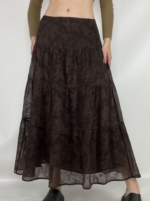 Vintage Brown Mesh Low Rise A Line Midi Skirt