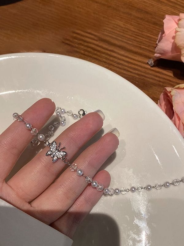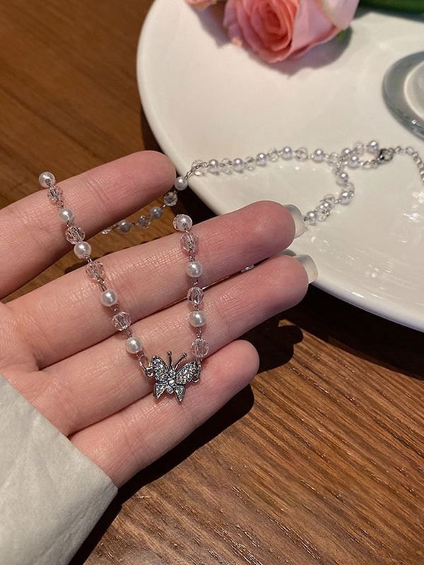 Rhinestone Butterfly Pendant Beads Necklace